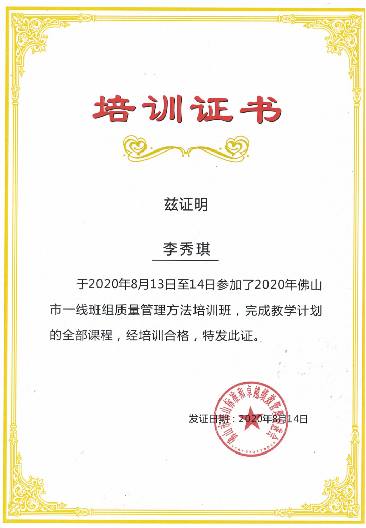 為了更好的服務顧客,加強企業管理,增強產品質量;我公司於2020年8月13日至14日派員參加了2020年佛山市一線班組質量管理方法培訓班,學習期間受益良多,以真實案例為背景,學習到了6S、精益生產等的重要性。